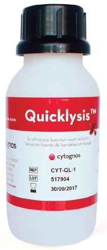Quicklysis™ is used in whole blood or bone marrow samples after immunofluorescence staining of the cells, and requires no subsequent washing-centrifugation steps reducing processing time and sample handling. Benefits of Quicklysis™